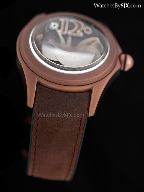 Fast genau wie das Original aber etwas größer, hat die Corum Heritage Bubble das gleiche übertriebene Saphirglas, so dick es verzerrt das Zifferblatt. Die Form ist sofort vertraut, nachdem sie in die populäre Denkweise eingegeben worden ist, wie modisch die ursprüngliche Bubble vor 15 Jahren war.